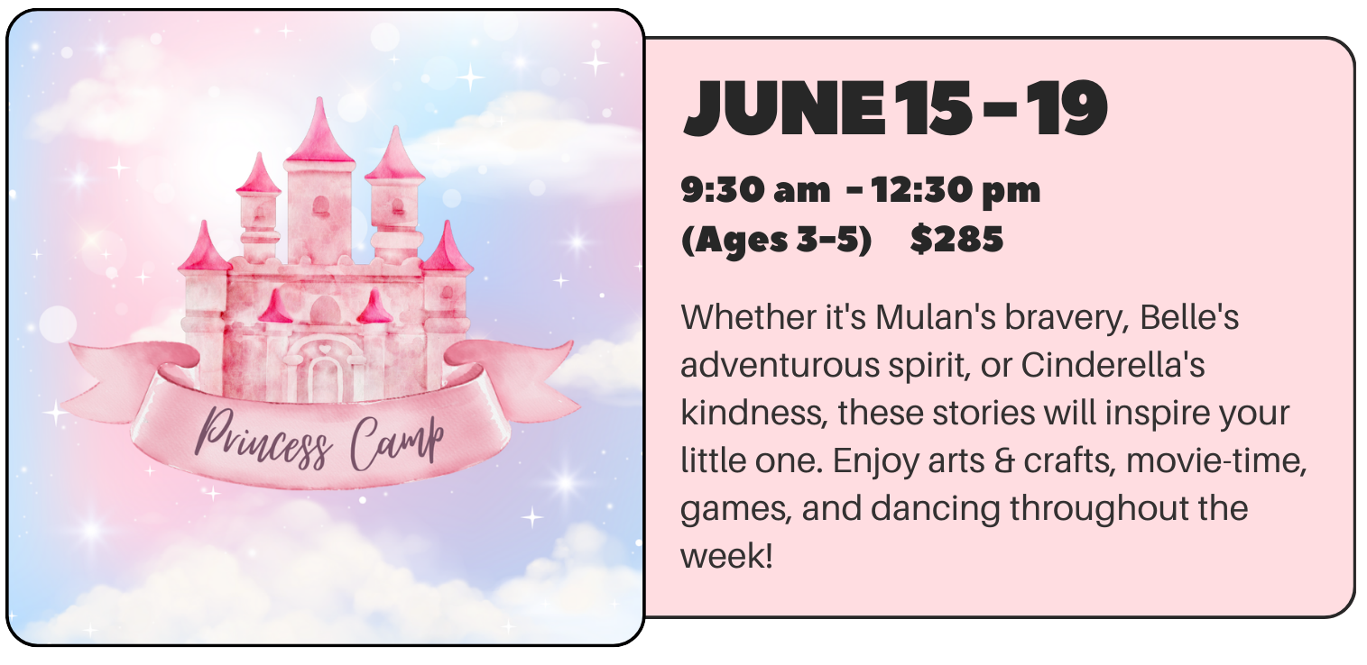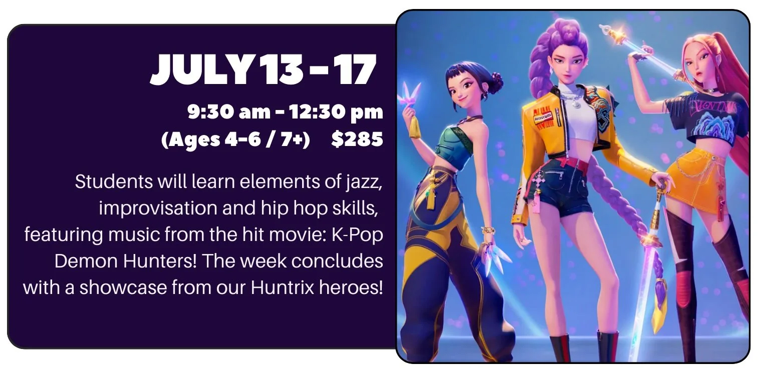 Join us during the summer months for a fun twist on our traditional styles and classes! Creativity and adventure abounds with princess tea parties or magic wand designing! Let our original productions transport you to the fantasy world of the Huntrix heroines!